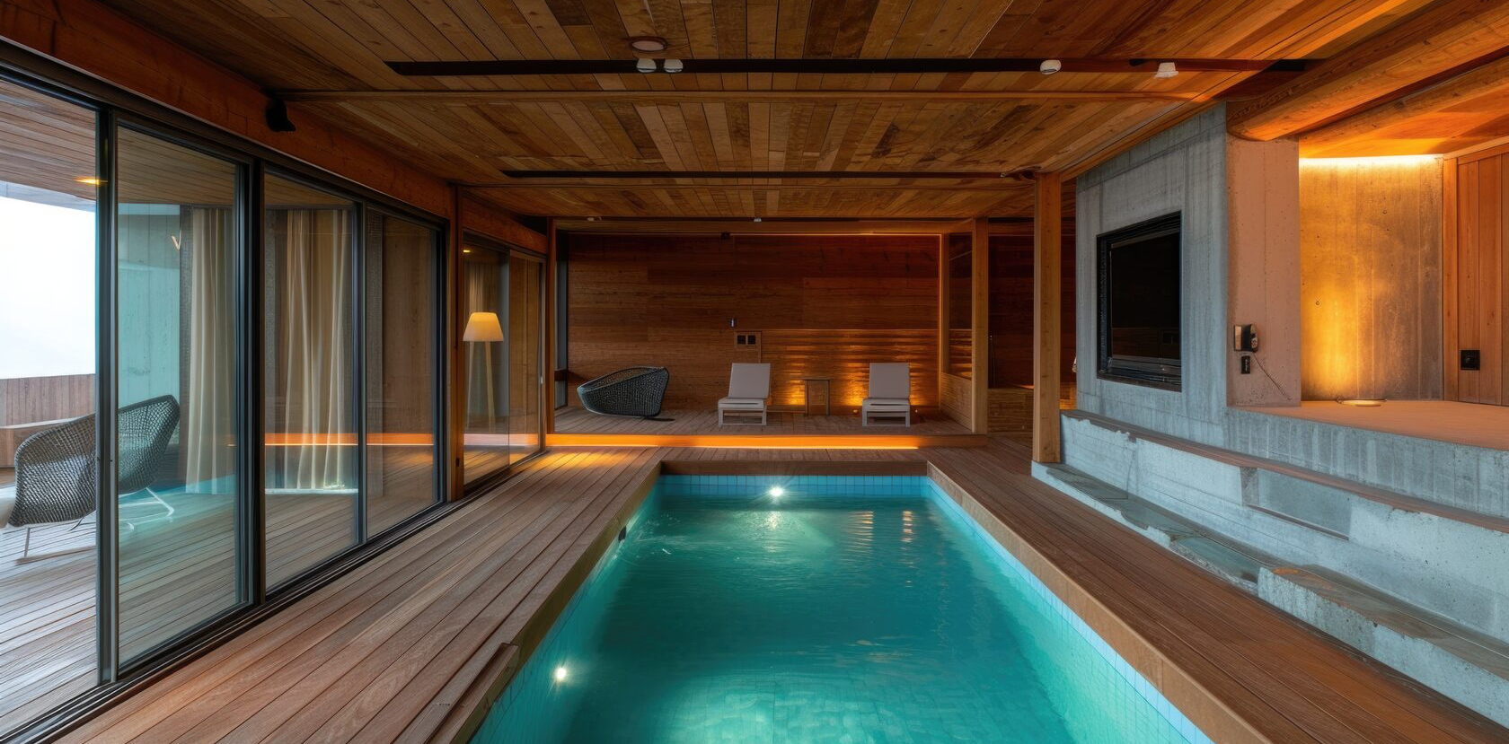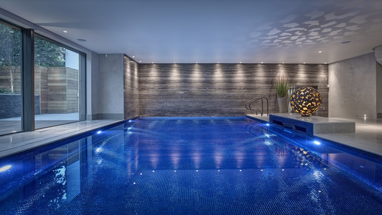 Большие плитки создают чистые и ровные поверхности, что визуально увеличивает пространство и придает бассейну элегантный и стильный вид.